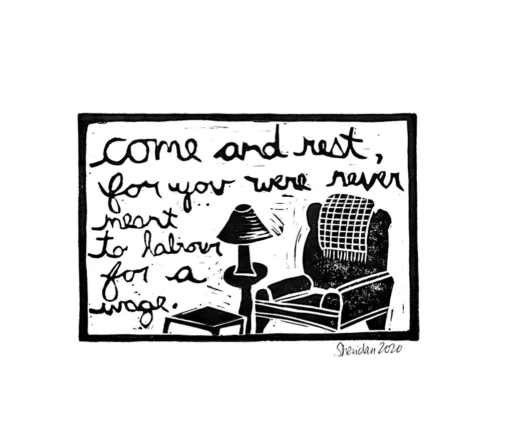 The text reads: “Come and rest, for you were never meant to labour for a wage.” This print was made both as a response to the lack of government support for workers during the COVID-19 pandemic and critiquing wage labour.